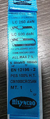 Toutes les sangles utilisées dans les systèmes d’arrimage Syncro System sont certifiées selon la norme DIN EN 12 195-2. Pour répondre à cette règlementation chaque sangle est dotée d’une étiquette qui indique toutes les données prévues dans le document, parmi lesquelles la capacité d’arrimage, l’allongement maximum et la matière constitutive de la sangle.