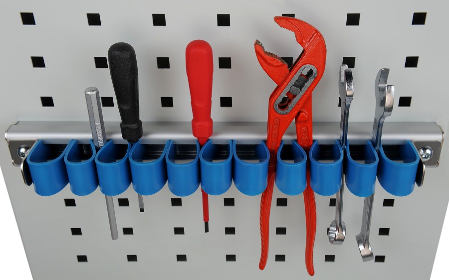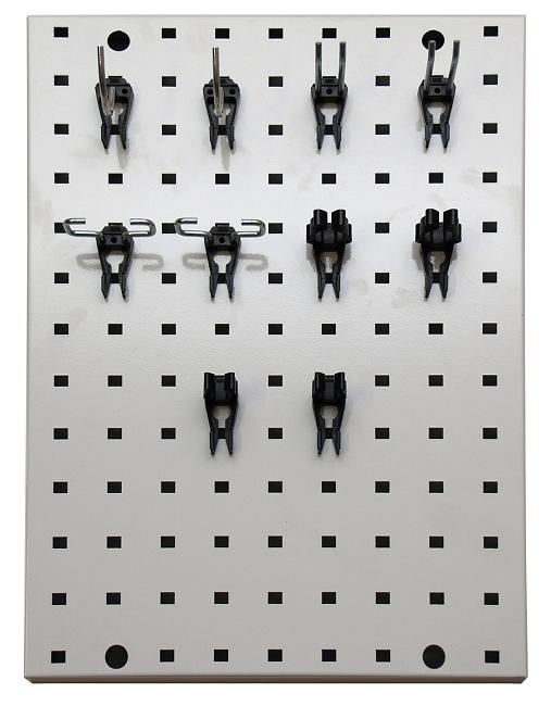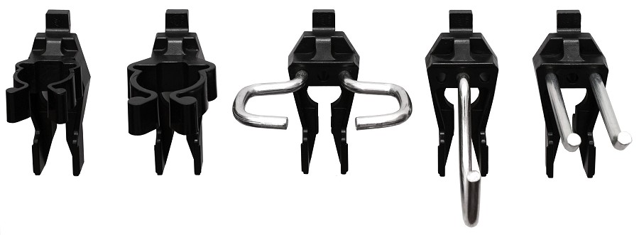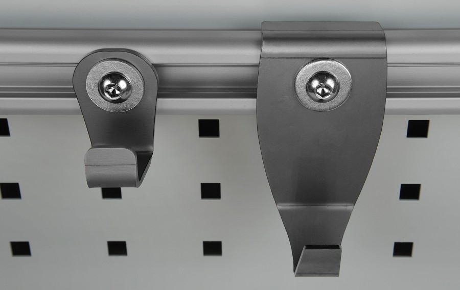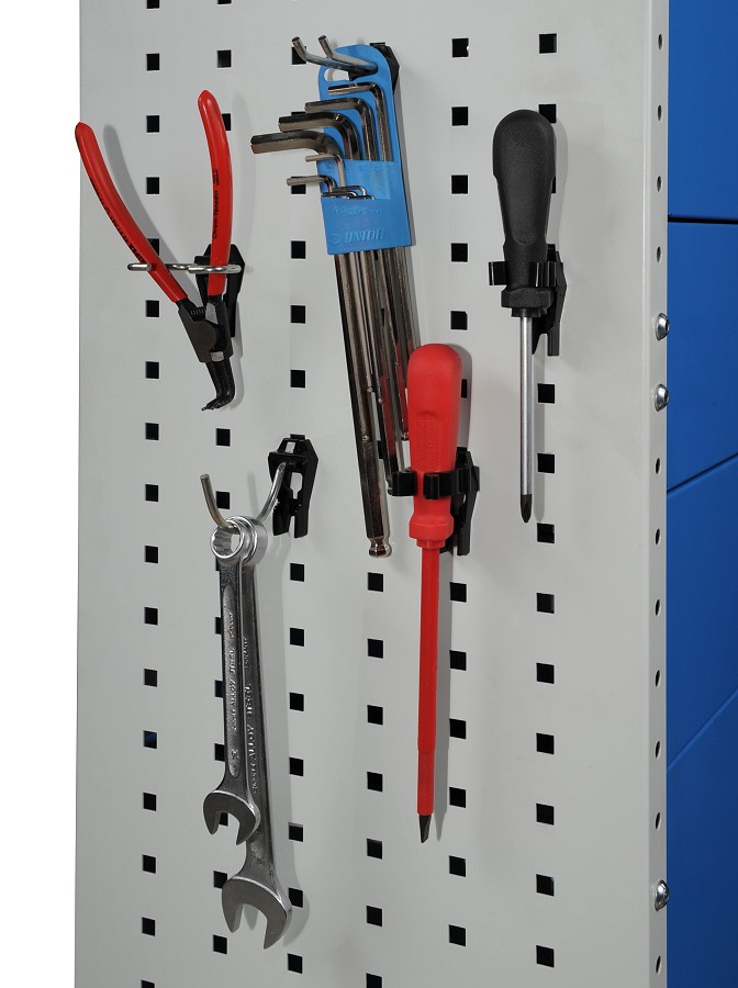 Les crochets en acier et plastique proposés par le catalogue Syncro ont été modifiés pour pouvoir être insérés directement dans ces trous, de même que sur les panneaux porte-outils et sur les revêtements perforés pour la protection des parois latérales. Les crochets sont disponibles en cinq modèles différents : à clip, pour tournevis, de taille grande ou petite ; en L pour câbles, pour pinces ou verticaux.