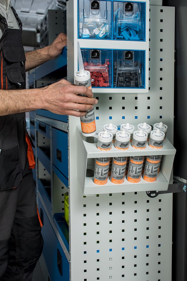 Cet accessoire offre un maximum de flexibilité pour la gestion des outils et des matériels à transporter de façon ponctuelle ou régulière à l’intérieur du fourgon. Il s’agit d’une barre réalisée en aluminium, modèle AAT00018, conçue avec deux profils : le profil antérieur qui sert à insérer et déplacer les accessoires, et le profil postérieur où l’on insère les vis à tête carrée qui permettent de fixer la barre sur l’aménagement Ultra, sans devoir faire de trous supplémentaires. Cette barre peut aussi être fixée selon les modalités de fixation normales, à la carrosserie du fourgon ou directement sur les parois.